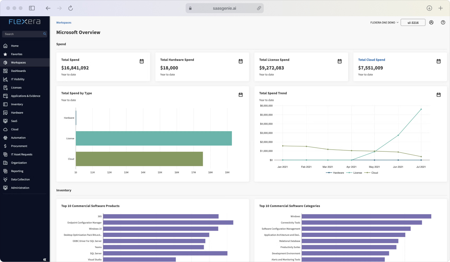 Flexera One specializes in software asset management and license optimization. The platform helps organizations track software usage, manage renewals, and maintain compliance with vendor licensing agreements.