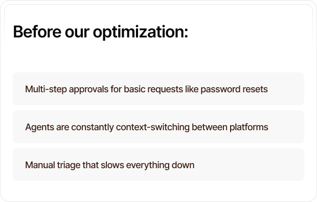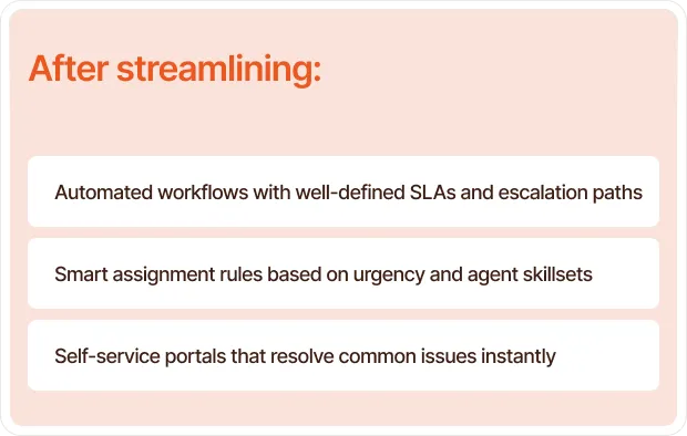 Poorly designed ITSM environments create unnecessary bottlenecks, making even simple requests feel like a bureaucratic obstacle course. Here’s what we typically transform: