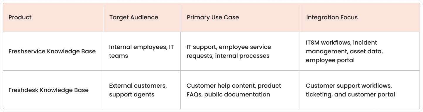A Freshservice article typically explains internal tasks like VPN access or device setup. A Freshdesk article more often covers product usage or customer-facing troubleshooting.