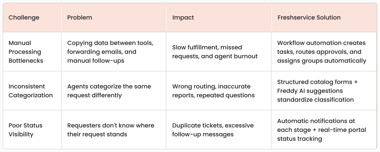These are real problems we see with clients and the practical solutions Freshservice provides. Each challenge maps to a specific control in the platform, such as workflow rules, structured forms, notifications, and workload views.