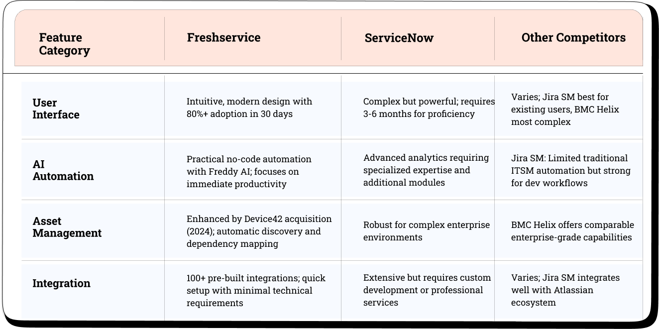 Here's a data-driven comparison of how Freshservice stacks up against leading ITSM platforms across critical decision factors: