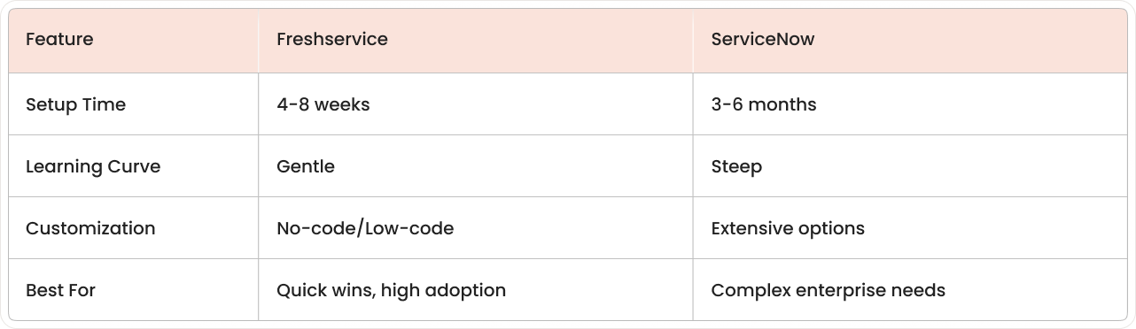 Mid-market teams (50-500 employees) often find Freshservice hits the sweet spot.You get professional incident management, asset tracking, and automation without needing a dedicated ServiceNow administrator or months of configuration work.