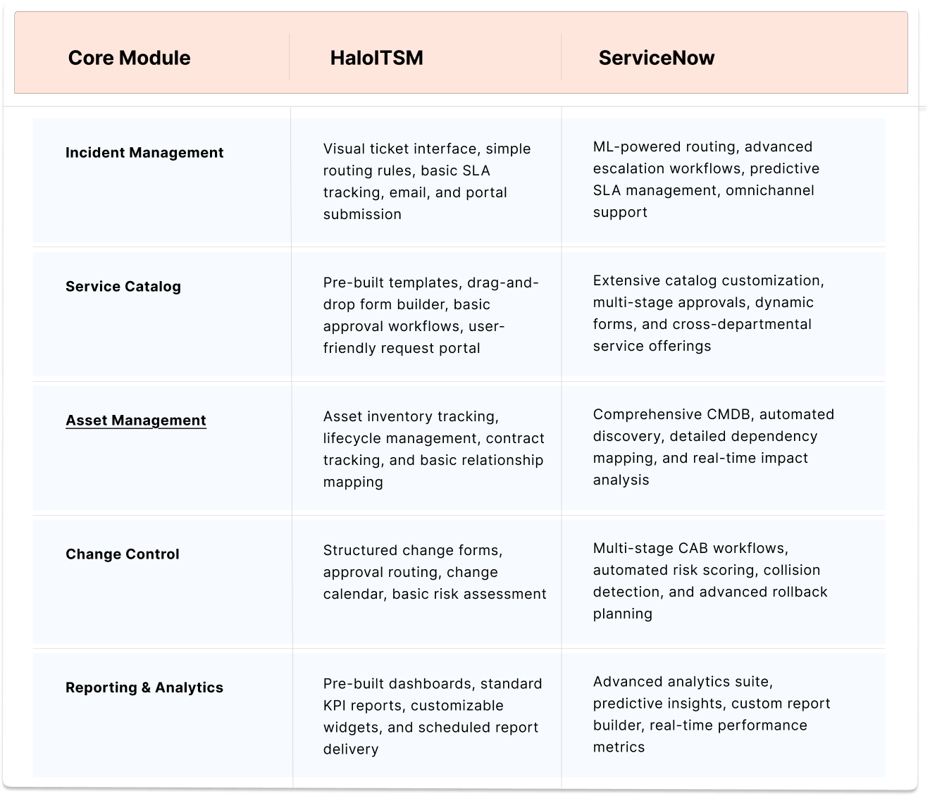 Here's how HaloITSM and ServiceNow actually handle the ITSM processes your team lives in daily. The table below gives you a quick snapshot of the key differences: