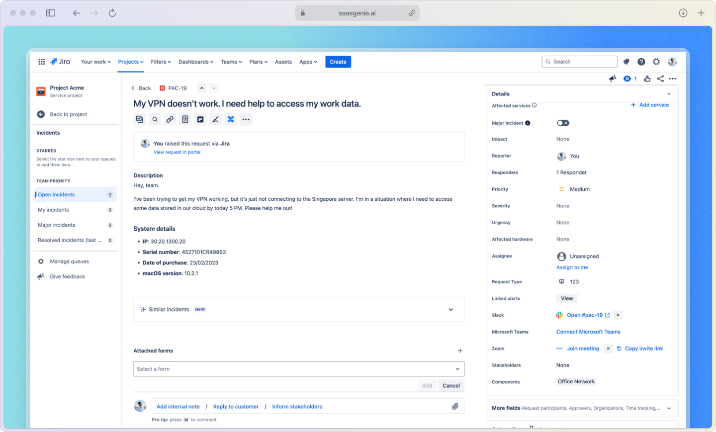 Jira Service Management is Atlassian's IT service management platform that centralizes the entire incident management workflow. Instead of juggling emails, phone calls, and sticky notes, your team works from one system where every incident gets logged, tracked, and resolved with full visibility.