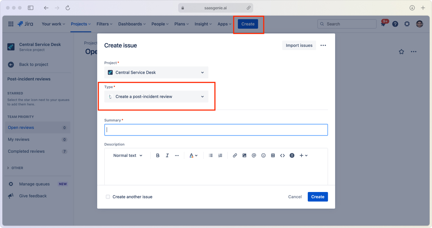 Jira provides PIR templates that guide teams through documenting the timeline, root cause analysis, what worked well, and improvement actions. These reviews become organizational knowledge that improves future incident response.
