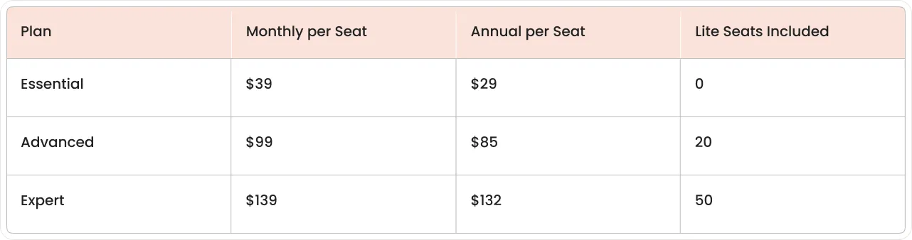 Expert brings enterprise features like custom roles and multibrand support. Fifty lite seats handle bigger organizations where lots of people need occasional access.