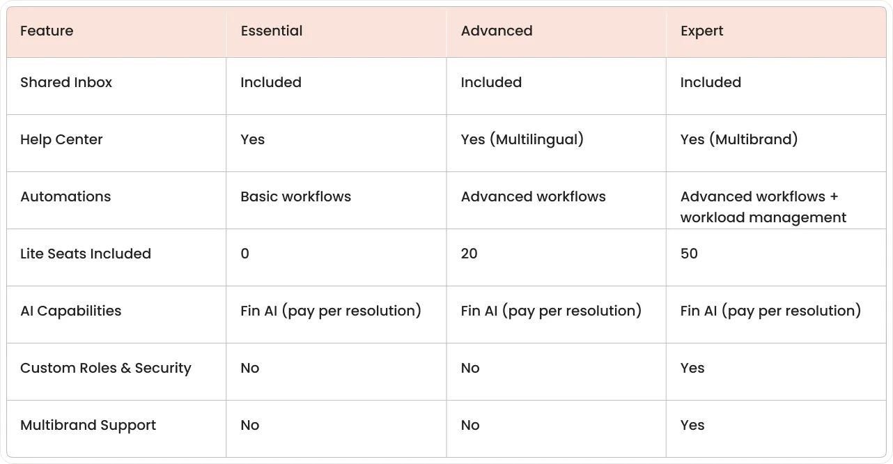 Essential is designed for individuals, startups, and small teams that want to keep customer support efficient without overcomplicating their tech stack. You get Intercom's core toolkit, shared inbox, help center, and basic automations. But no Lite seats for free collaborators.