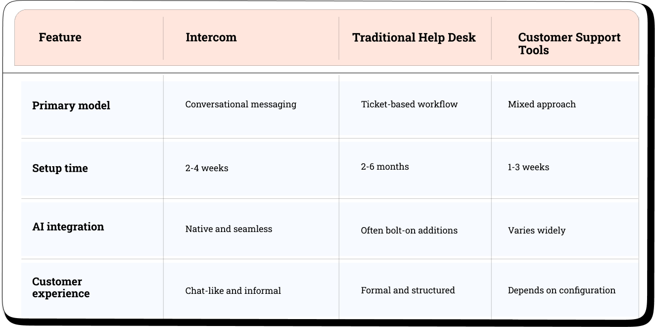Intercom takes a fundamentally different approach than traditional ticketing systems like Zendesk, Freshdesk, or ServiceNow. Instead of formal case management, Intercom emphasizes ongoing customer relationships through conversational messaging.