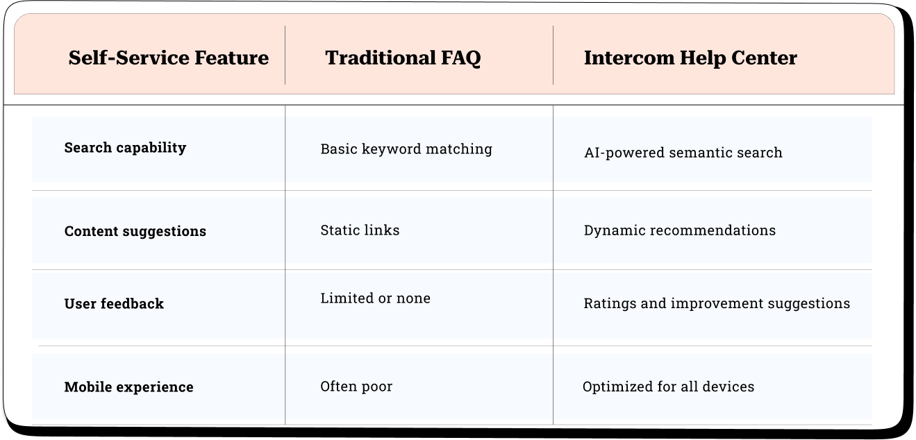 Self-Service FeatureTraditional FAQIntercom Help CenterSearch capabilityBasic keyword matchingAI-powered semantic searchContent suggestionsStatic linksDynamic recommendationsUser feedbackLimited or noneRatings and improvement suggestionsMobile experienceOften poorOptimized for all devices_According to _Harvard Business Review,_ siloed knowledge slows teamwork by up to 30% and causes extra work._